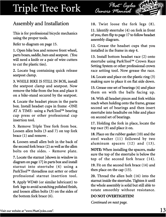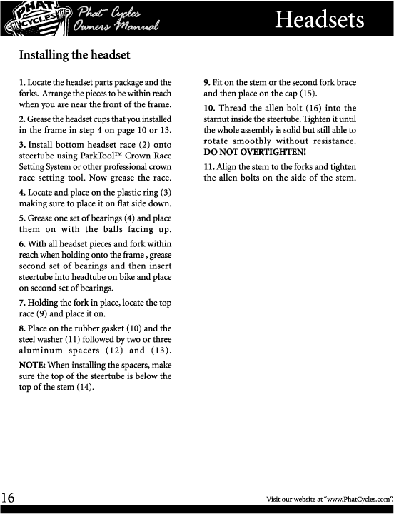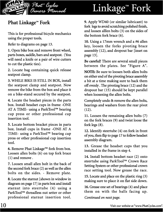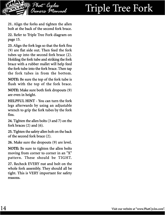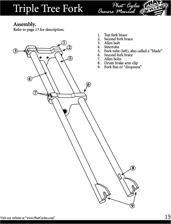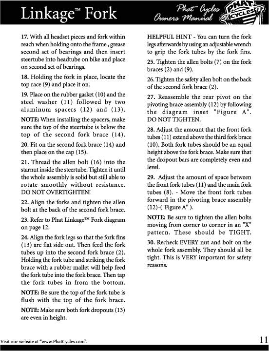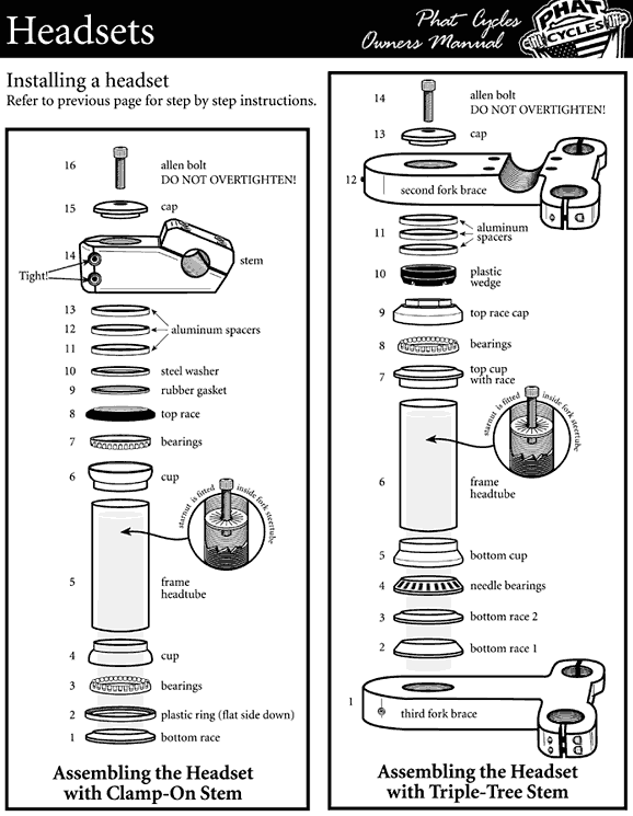 We have made available our entire owners manual as individual diagrams (as images) able to be downloaded and printed. Please direct your technical inquiries to us by e-mail.. See diagram links below: Linkage Fork Diagram for Assembly Linkage Headset Diagram for Assembly When the diagrams open, you can download them by right clicking (PC) or clicking and holding (Mac) the image. |
